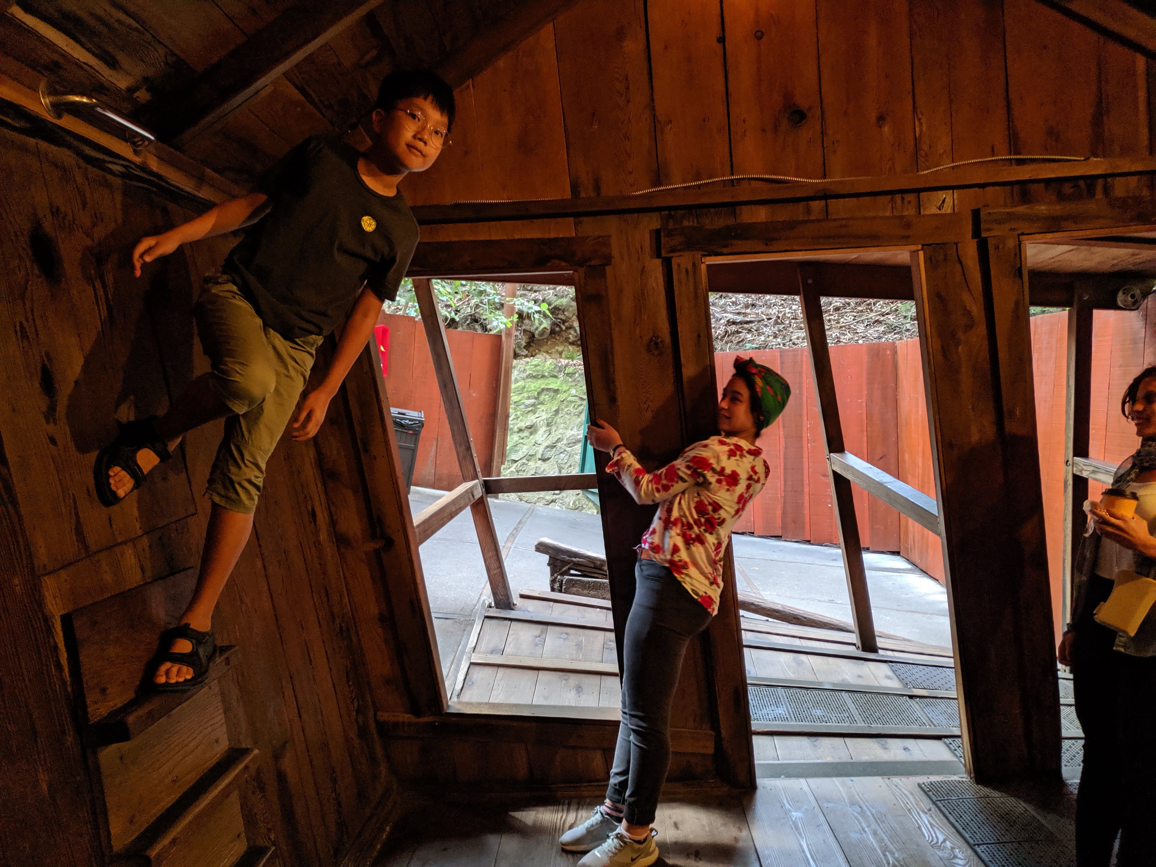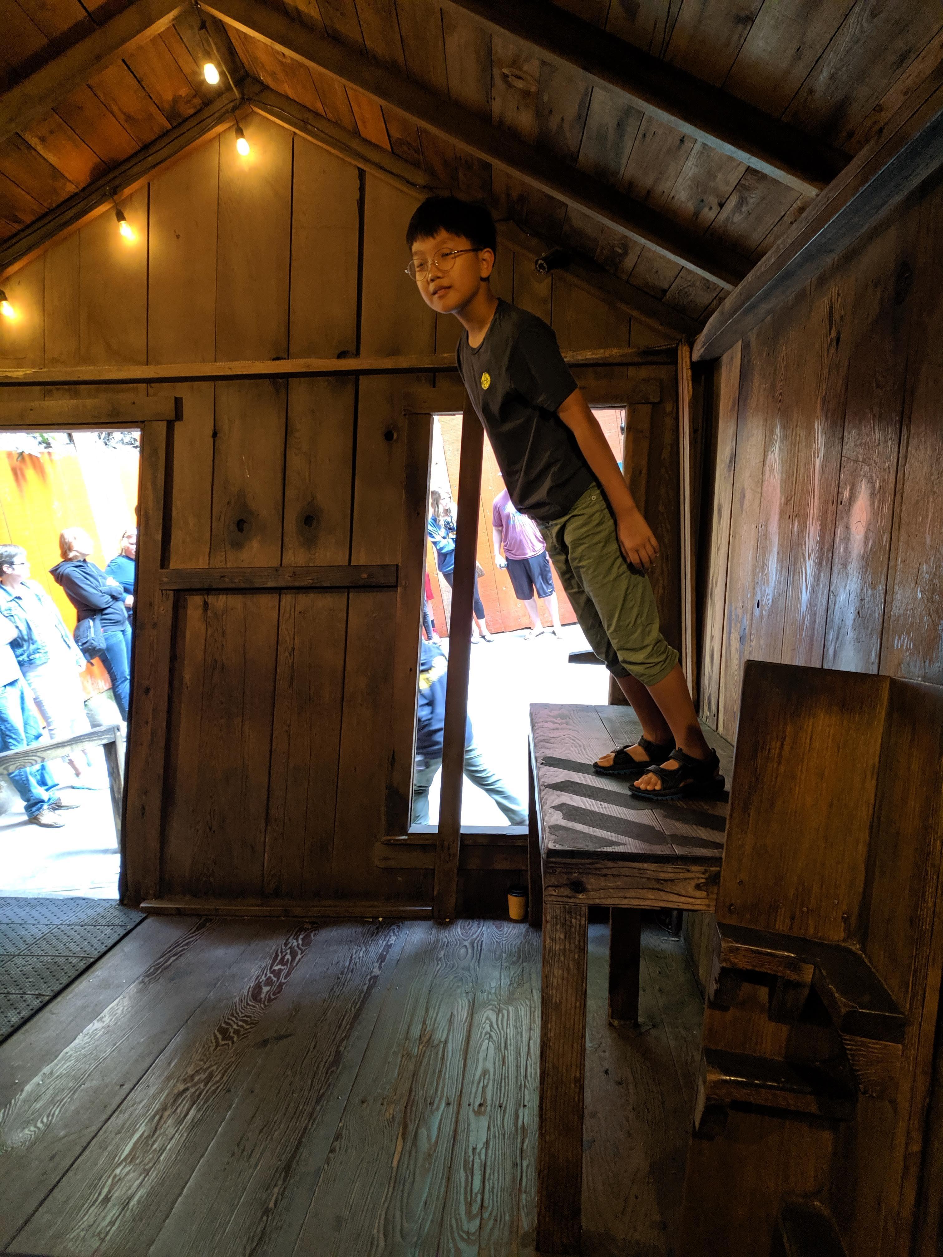 옆에 있는 사람은 기둥 잡고 있는데, 벽타고 올라갈 수도 있는 신기한 집이다.