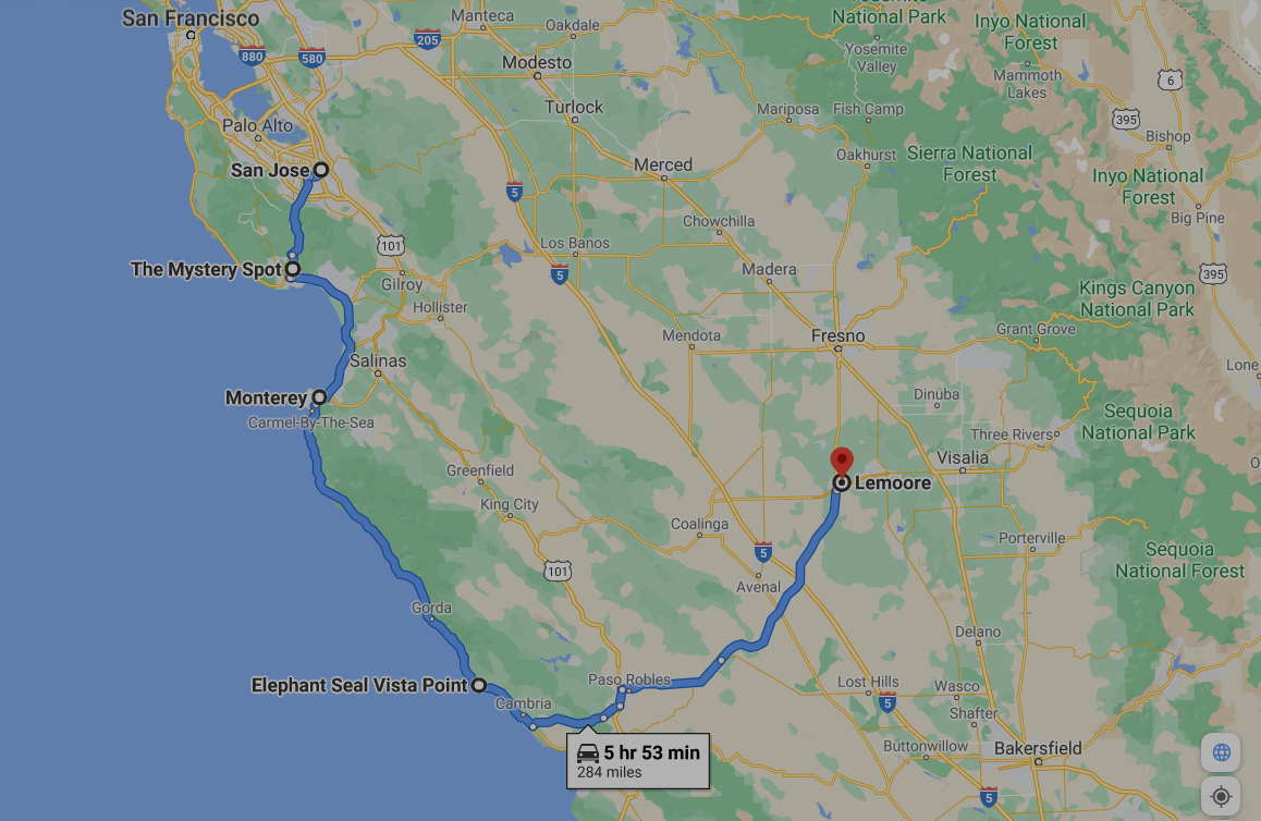 이동 경로: 산호세 출발 → The Mystery Spot → Monterey → 1번 국도 → Elephant Seal → Lemoore
