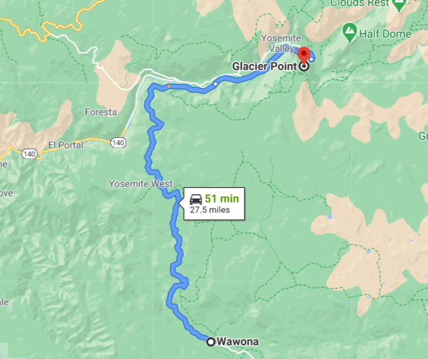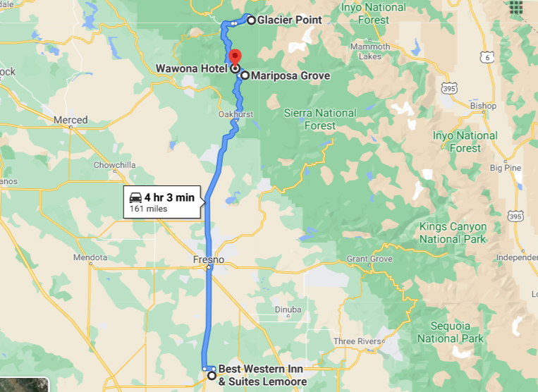 이날의 이동 경로: Lemoore 출발 ➡️ Mariposa Grove (마리포사 그로브) ➡️ Glacier Point (글래시어 포인트) ➡️ Big Trees Lodge