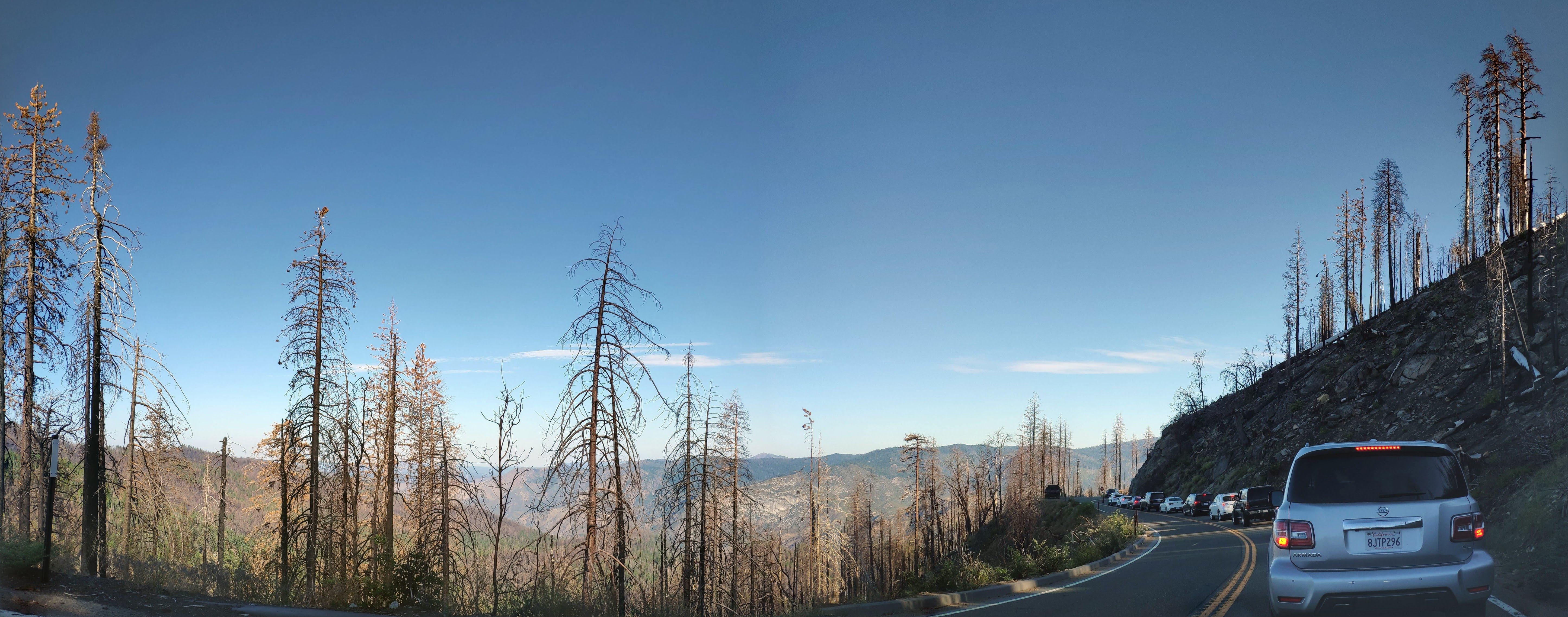지난 포스팅에서 살짝 언급했지만, 요세미티 밸리에서의 산불로 인해서 저렇게 타버리고 만 나무들이 곳곳에 있다. 밸리쪽으로 가면서 더 많아졌던 것으로 기억한다. 저렇게 많은 차들을 따라 쭈욱 이동을 하면 위 지도에서 보듯, 남쪽에서 진입한 우리쪽 차량과 서쪽 입구, 북쪽 입구에서 온 차량들이 모두 하나의 길로 모여 밸리로 향하게 되는데, 남쪽에서 오는 도로만 통과하는 곳이 하나 있는데...