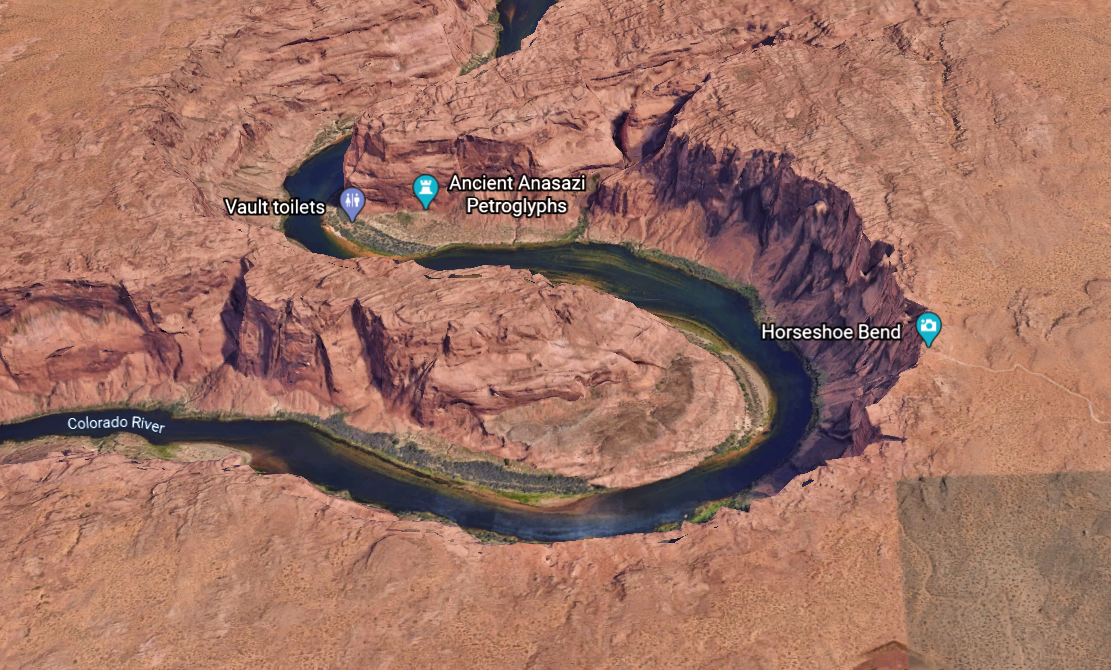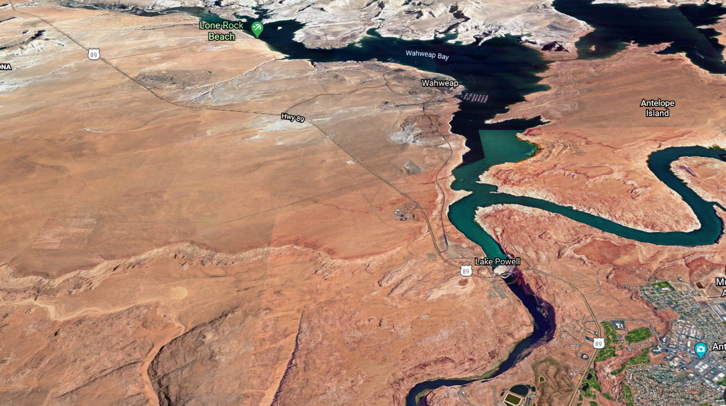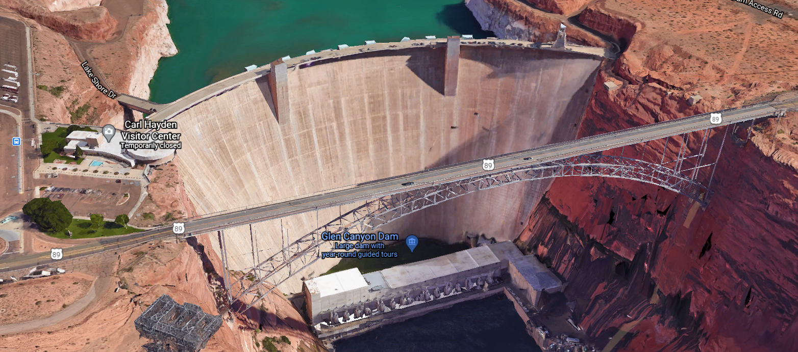 페이지로 들어가기 전 Glen Canyon Dam을 지나는 다리가 굉장히 압도적인 느낌을 주었는데, 요즘은 진짜 랜선 여행이라는 표현이 가능하게 해 주는 툴이 많아서 좋은 듯 하다. 구글 어스를 확대하니 아래처럼 보여준다.