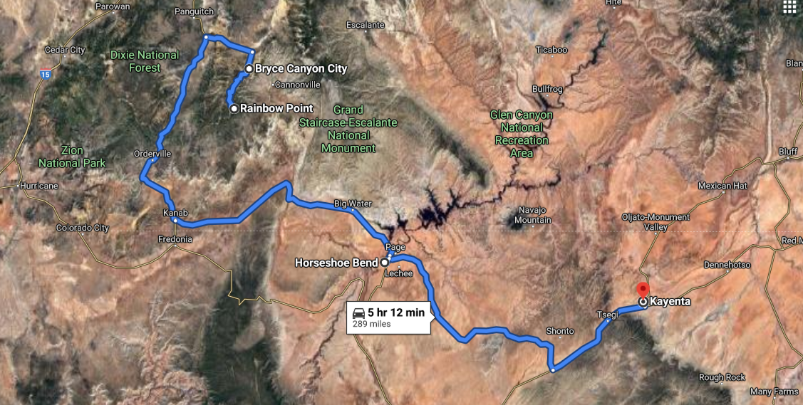 이날의 이동 경로: Bryce Canyon (incl. Navajo-Queen's Garden Trail) ➡️ 호스슈벤드 (Horseshoe Bend) ➡️ 카이옌타 (Kayenta)