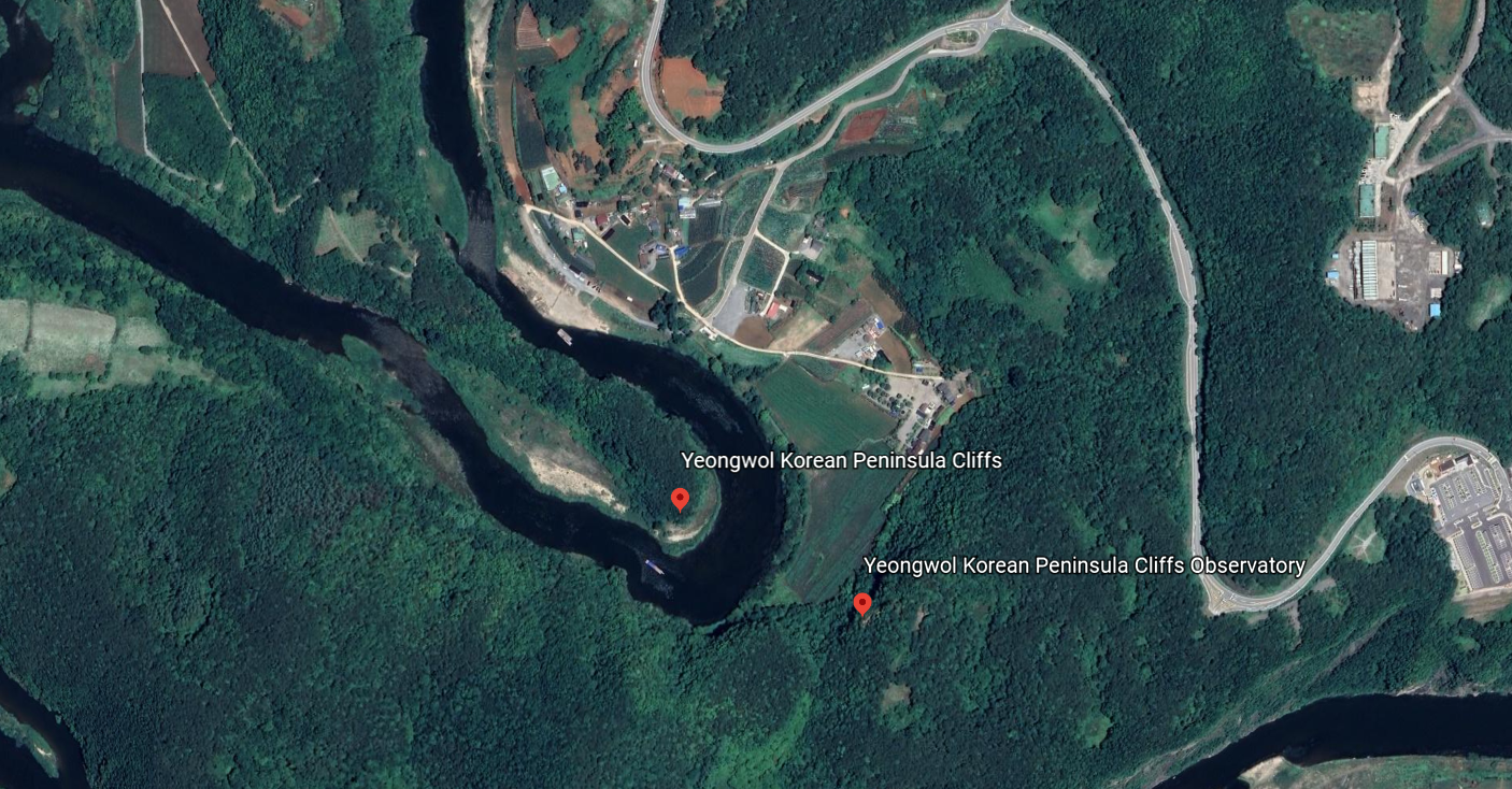 사실 규모는 많이 다르지만, 우리나라도 영월에 있는 한반도지형은 볼만하다. 구글어스가 우리나라 지도는 이쁘게 표시가 안 되는 점이 좀 아쉽지만 구글 어스로 둘을 비교해 봤다.