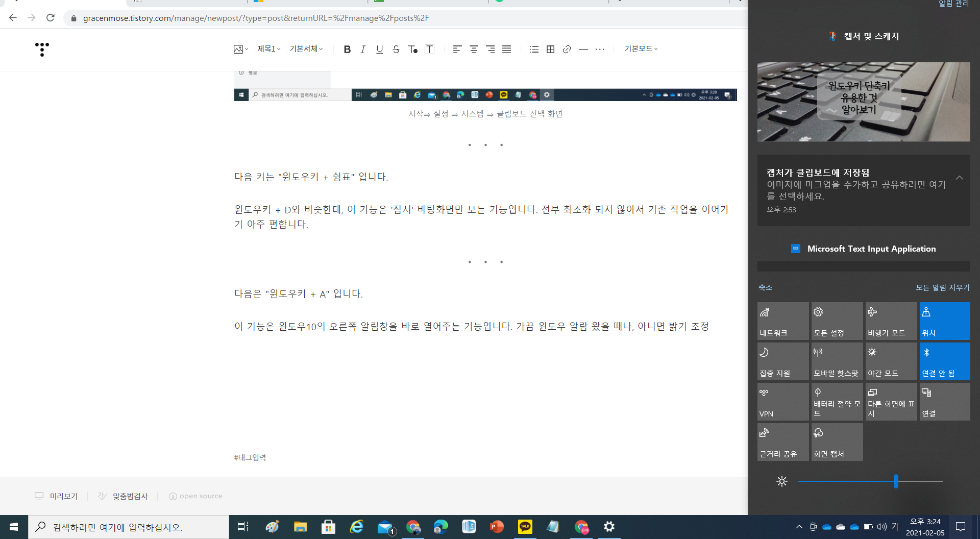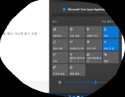 이 기능은 윈도우10의 오른쪽 알림창을 바로 열어주는 기능입니다. 가끔 윈도우 알람 왔을 때나, 아니면 밝기 조정 같은 것이 필요할 때 쉽게 할 수 있는 것이죠.