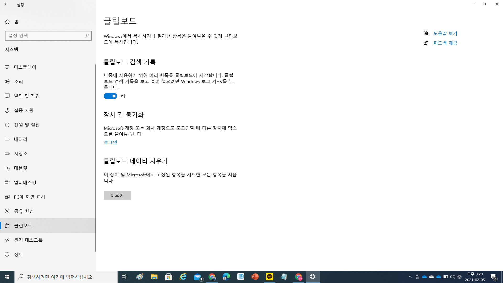 이 기능은 최신 윈도우10에서 (아마도 가능한 최신 버전) 작동이 되고, 작동이 안 되는 경우에는 "시작 > 설정 > 시스템 > 클립보드를 선택한 다음 클립보드 기록" (아래 화면 참조)을 켜면 됩니다. 윈도우 계정으로 동기화하면 같은 계정으로 로그인 한 기기에서는 장치간 동기화까지 된다고 하니.. 이건 가히 혁명입니다!