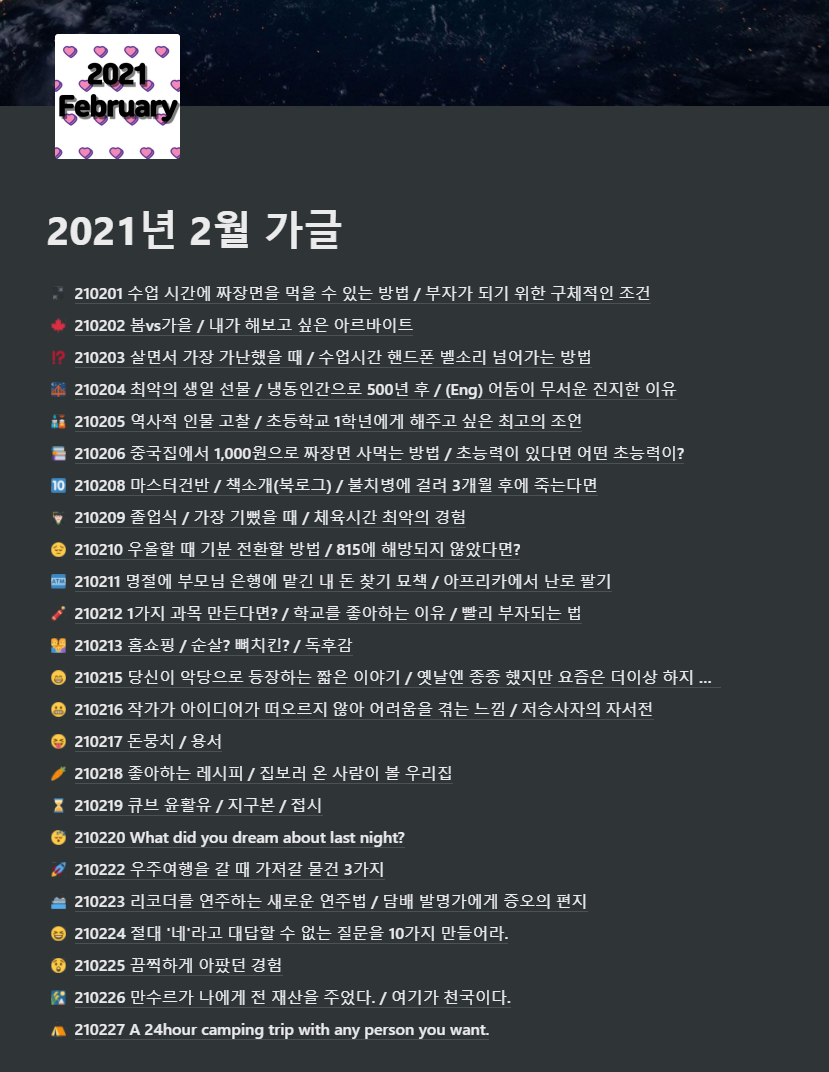 2월에는 아래와 같은 주제로 했습니다. 2월의 일요일이었던 7의 배수 날만 빼고 약속한 날에는 하루도 안 빠지고 다 썼습니다.