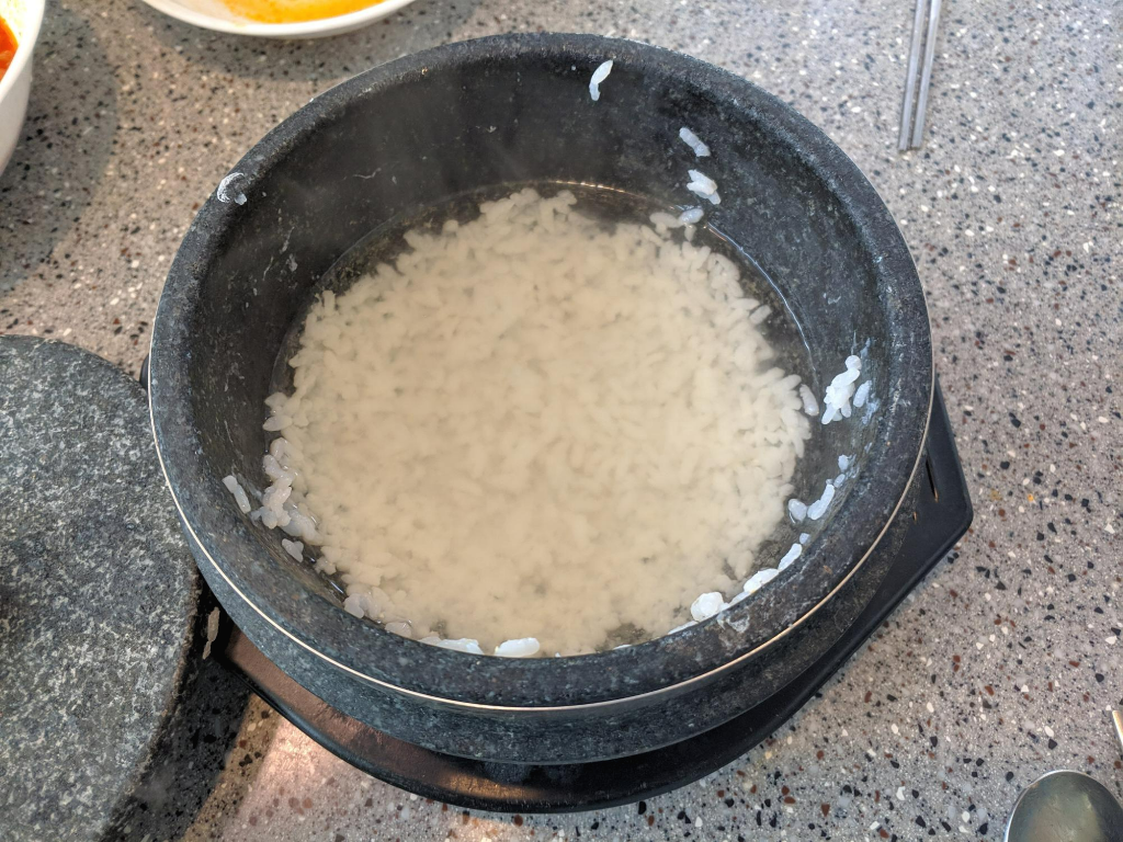 7. 밥을 다 푼 돌솥에 남은 누룽지에 물을 붓고 뚜껑을 덮는다.