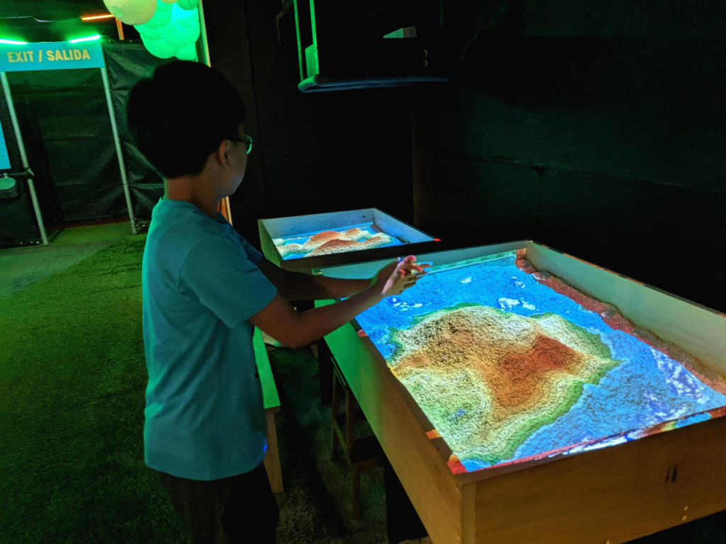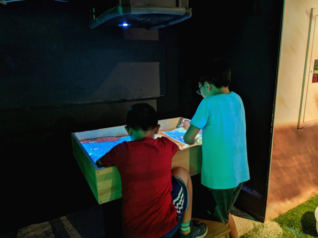 과학관들은 기본적으로 체험할 수 있는 거리가 많다. 그게 재미 있기 때문에 아이들이 좋아하는 장소이기도 하다. 바로 위에 보이는 사진은 틀 안에 있는 모래를 가지고 산 형태로 만들면 높이에 따라 색이 점점 붉어지면서 등고선처럼 보여주는 기계다. 다른 곳에서도 해 본 것인데 여기서 또 보니 반가웠다. 전시관의 규모가 기대보다는 살짝 작은 느낌이었지만, 이것저것 아이들의 눈길을 끄는 체험은 다양하다.