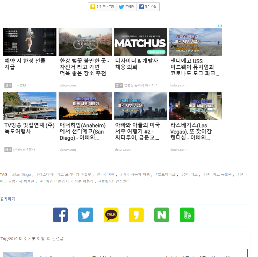이렇게 하면 일치하는 콘텐츠가 본문 하단에 위치하게 됩니다. 기본적으로 아래 화면처럼 '카카오스토리, 트위터, 페이스북' 아이콘 아래와 '관련글' 목록 위 사이에 해당 콘텐츠가 나오게 됩니다. (당연히 본문 영역 이후에 나와야 하니까요)