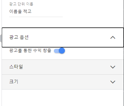 광고 단위 이름을 적고, 광고 옵션은 당연히 수익 창출이 목적이니 그대로 활성화 하고, 스타일은 변경할 필요 없어 보이고, 크기 역시 반응형으로 해 두어야 화면에서 깨지지 않기 때문에 반응형으로 해 둡니다.
