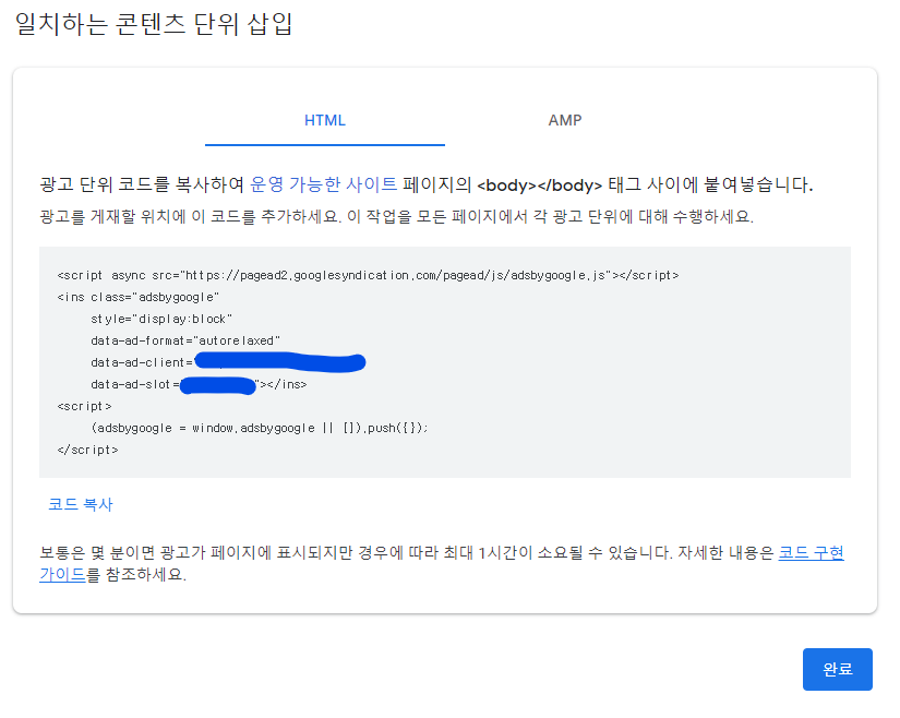 전체를 다 붙여 넣어도 별 문제는 없지만, 맨 위 adsbygoogle.js 를 다시 로드하는 과정은 또 할 필요가 없습니다.