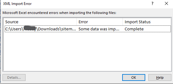 저장된 sitemap.xml을 '엑셀'을 이용하여 엽니다. 엑셀에서 해당 xml 파일을 열려고 하면 아래와 같이 팝업이 뜨는데 XML table로 열기를 선택하면 됩니다.