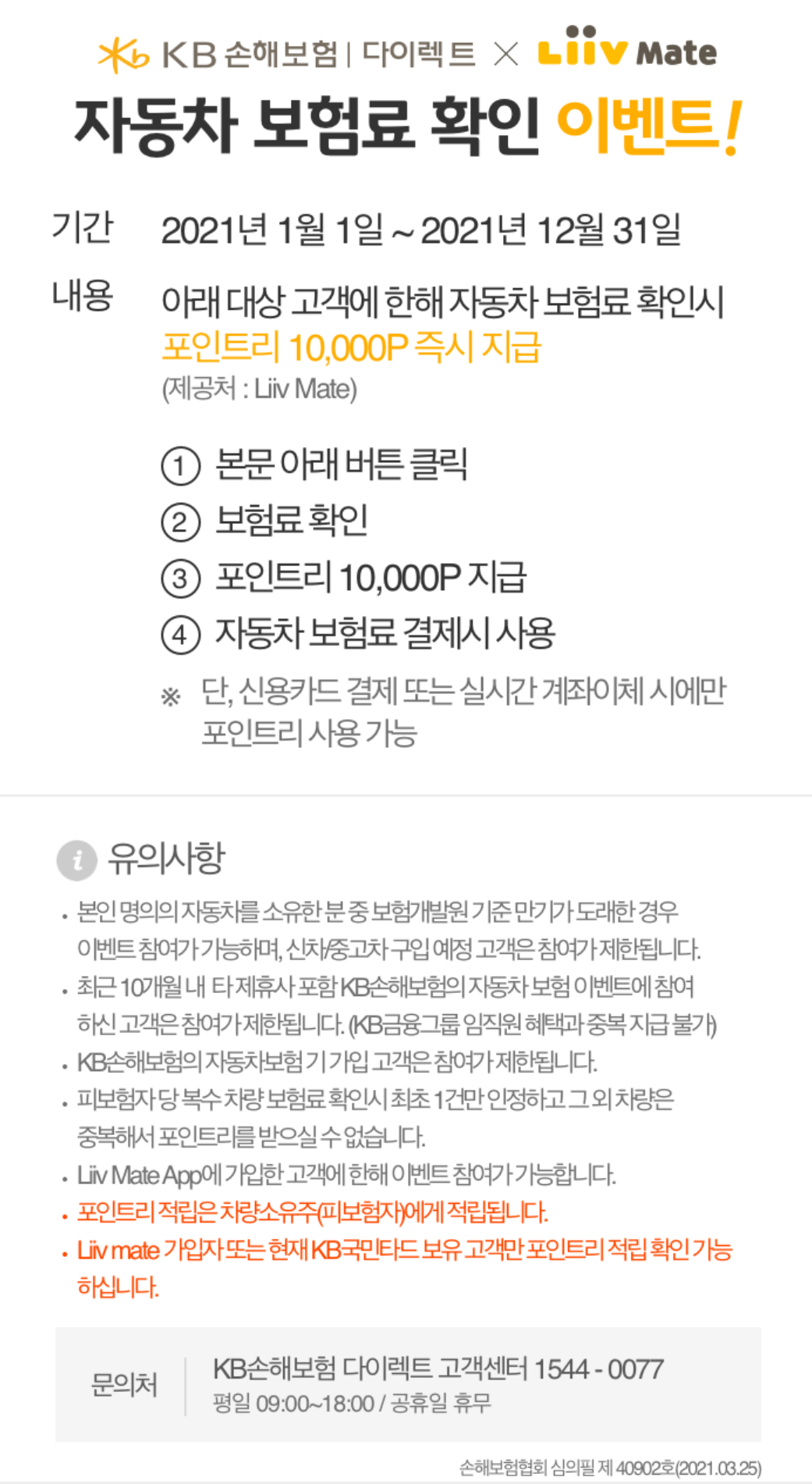 KB손해보험 다이렉트 - 하나멤버스 또는 리브메이트 1만점