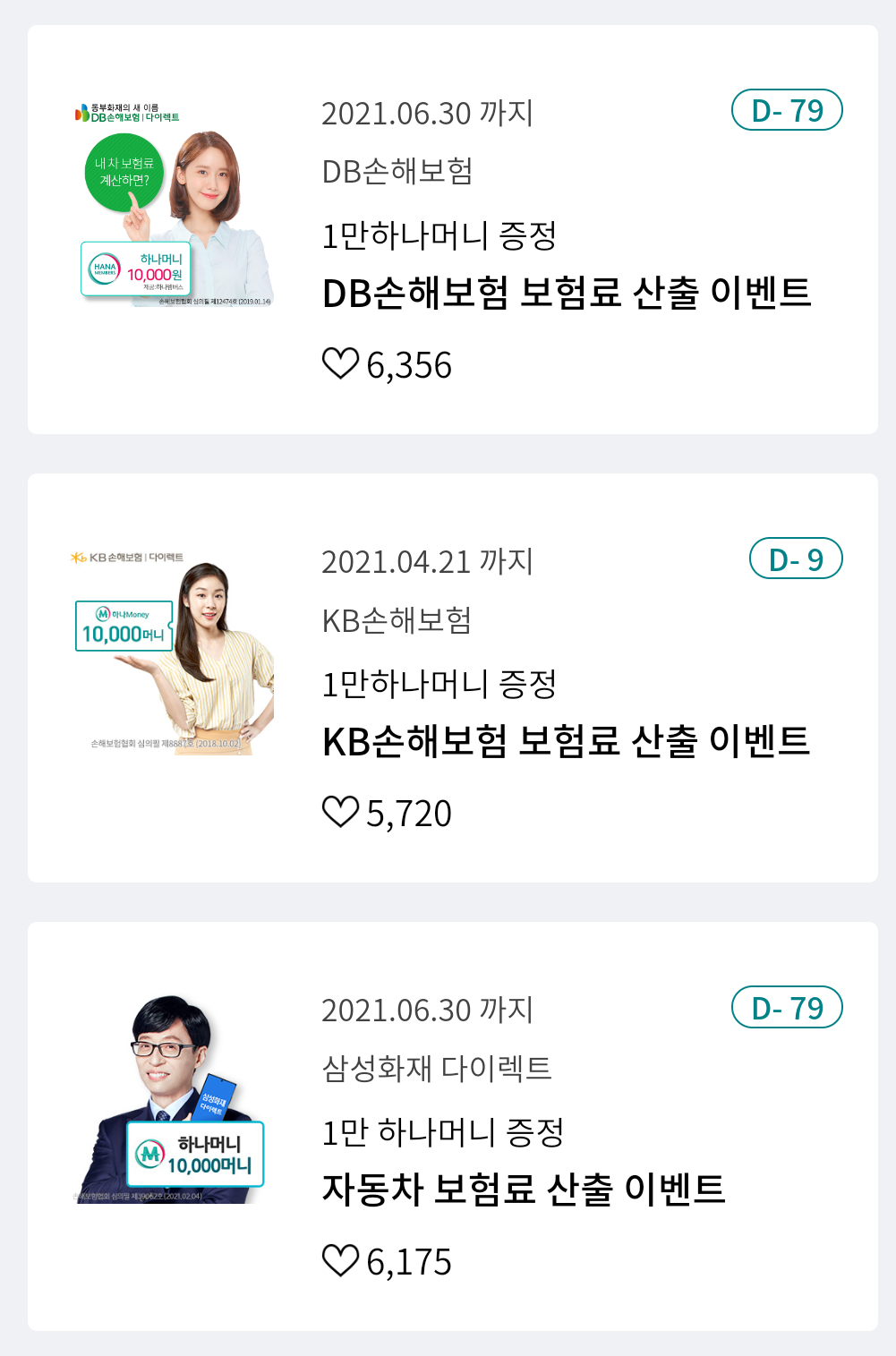 하나멤버스 (안드로이드, 애플 모두 가능) 에서 이벤트 페이지로 가면, 통상 가장 하단에 자동차 보험 이벤트가 모여 있습니다.