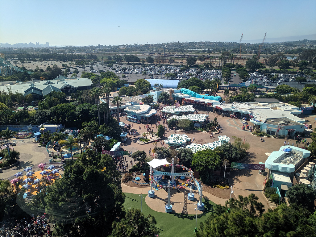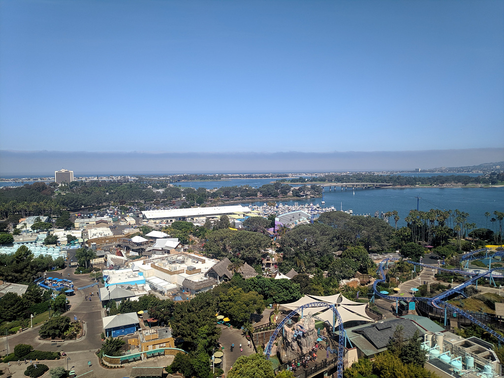 씨월드 한가운데에는 스카이타워라는 것이 있다. 높은 곳에 올라가서 한 바퀴 돌면서 씨월드 주변 전망을 볼 수 있는 곳인데, 입장권으로는 이용할 수 없고 별도로 티켓을 사야하는 곳이다. 다시 오기 힘든 곳이기에 과감하게 표를 사서 이용을 했다. 정말 멋진 모습을 볼 수 있다. 발아래로 씨월드가 한눈에 보인다. 범고래, 돌고래쇼가 있을 곳도 보이고, 놀이공원에 설치된 레일을 따라 움직이는 어트랙션들도 멋지다. 무엇보다 씨월드 주변의 베이를 보는 것이 좋았다. 특히나, 눈이 뻥 뚫리게 시원한 미국의 하늘에서 보는 모습은 더더욱 멋지다.