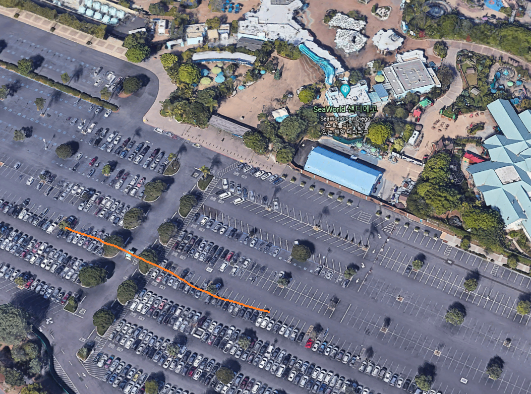 자본주의 최적화된 미국이라는 곳은 정말 재미있게도 주차장에서도 그 모습을 적나라하게 드러낸다. 우리처럼 서둘러 아침부터 온 차량들로 가득한 주차장 입구. 주차장은 기본 $20 에서 시작을 해서, '조금 더' 가까운 곳으로 가려면 $25, 'VIP' 파킹은 $35 이런 식으로 주차 위치에 따라 주차비도 달라진다. 구글 어스에서 찾아본 씨월드 주차장의 모습을 보면 아래와 같다.