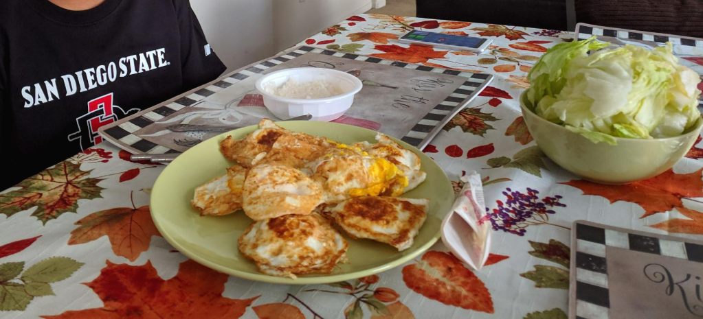 월마트에서 계란값이 싸다고 해서 사 놓은 계란이 너무 많았다. 어차피 같이 숙소에 지내고 있던 대학생에게 남은 것을 쓰라고 할 것이었지만, 든든하게 배를 채워야 한다는 생각에 엄청난 양의 계란후라이로 아침을 준비했다. 아래 사진이 그 증거다. 대체 몇 개의 후라이인 것인가. 그 옆에는 함께 한 양상추. Joshua는 생야채를 매우 잘 먹는 아이다. 너무나 맛있게 먹는 모습이 보여서 뭐를 저리 맛있게 먹는지 쳐다보면 당근, 양배추, 양상추, 파프리카 같은 것을 먹고 있을 때가 많다.