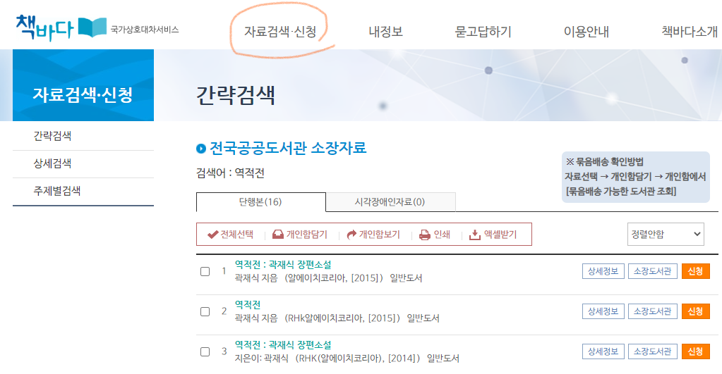 책바다 서비스 - 내가 주로 가는 도서관으로 전국의 자료를 받아 볼 수 있는 서비스