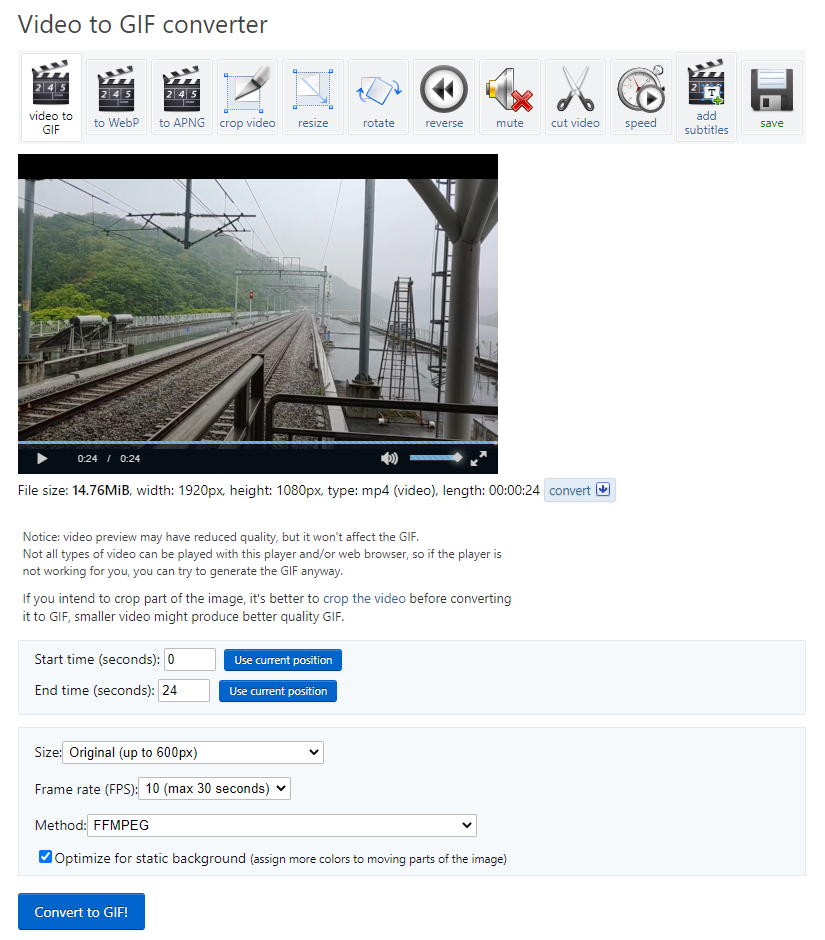 🔻 변환할 시간 지정을 마치면 Convert to GIF를 눌러서 변환합니다. 제가 올린건 동영상 14.8메가 영상이 gif로는 31.7메가로 변환이 되었네요. 10메가 넘지 않게 하려면 해상도를 낮추거나 자르기 등을 해도 됩니다. 이번 포스팅에서는 10메가 넘는 것 올리기 편이니 30메가짜리 파일을 그대로 쓰겠습니다.