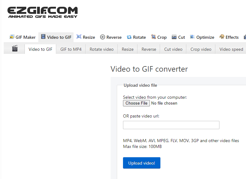 🔻 먼저 변환하고자 하는 동영상 파일을 두 번째 메뉴인 Video to GIF로 들어가서 업로드 합니다. 지원하는 파일은 MP4, WebM, AVI, MPEG, FLV, MOV, 3GP 등 거의 대부분의 영상파일은 다 지원이 됩니다.