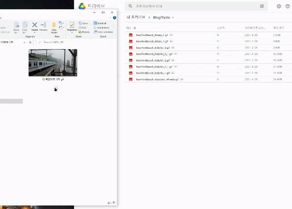 🔻 구글 드라이브에 파일 올리기는 너무나 간단하고 쉽습니다. 파일 탐색기에서 업로드하려는 파일이 있는 폴더 열어두시고, 웹브라우저로 구글 드라이브 접속하여 로그인 해 둔 창에다가 탐색기의 파일을 끌어서 투척하면 바로 올라갑니다.
