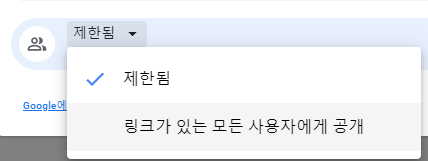 🔻 제한됨을 눌렀을 때 뜨는 메뉴, 아래쪽의 "링크가 있는 모든 사용자에게 공개" 선택