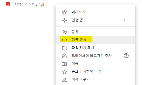 🔻 업로드한 파일로 마우스를 가져간 다음에 '링크 생성' 메뉴를 선택합니다.