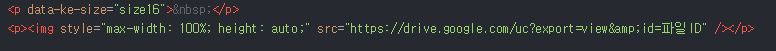 즉 최종 코드는 <div align="center"><img style="max-width: 100%; height: auto;" src="https://drive.google.com/uc?export=view&id=파일ID" /></div> 이렇게 넣으면 됩니다.