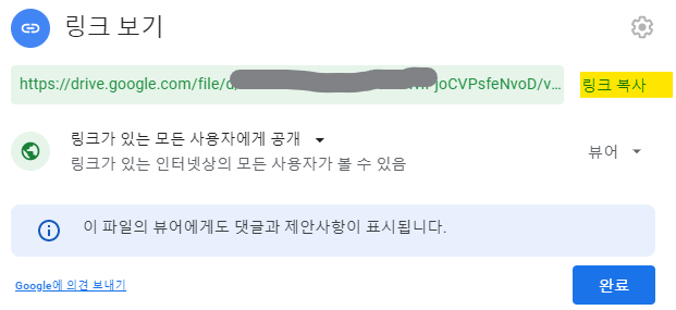 🔻 그럼 좀 전의 화면에 주소창이 녹색으로 바뀝니다. 주소창 옆의 '링크 복사'를 누릅니다. 링크 복사 아래에 있는 '뷰어'라고 되어 있는 것이 기본인데, 우리는 당연히 이 파일을 보여주기만 할 것이니 뷰어 외의 권한으로 바꿀 필요 없으니 신경쓰지 마세요.