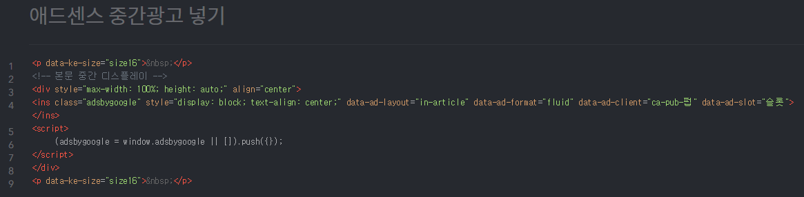 🔻 애드센스 중간 광고 넣는 코드는 HTML에서 넣어야 하니 HTML로 바꿔서 구글에서 가져온 코드를 붙여 넣어줍니다.