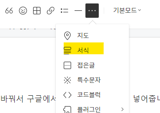 🔻 서식 메뉴는 PC에디터 상단의 '기본모드' 글씨 옆에 점 세개 버튼을 눌러야 나옵니다.