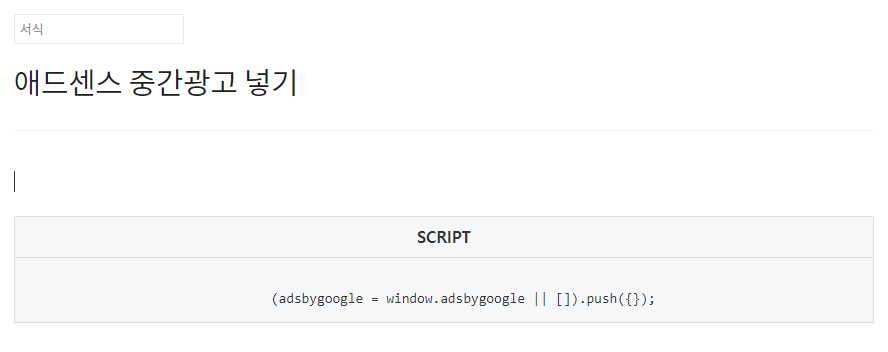 🔻 그럼 본문 글 작성하는 것과 똑같은 화면이 뜹니다. 거기서 필요한 서식을 만드세요. 저는 애드센스 중간광고 넣는 것을 만들어 보겠습니다. 제목을 우선 적으세요.