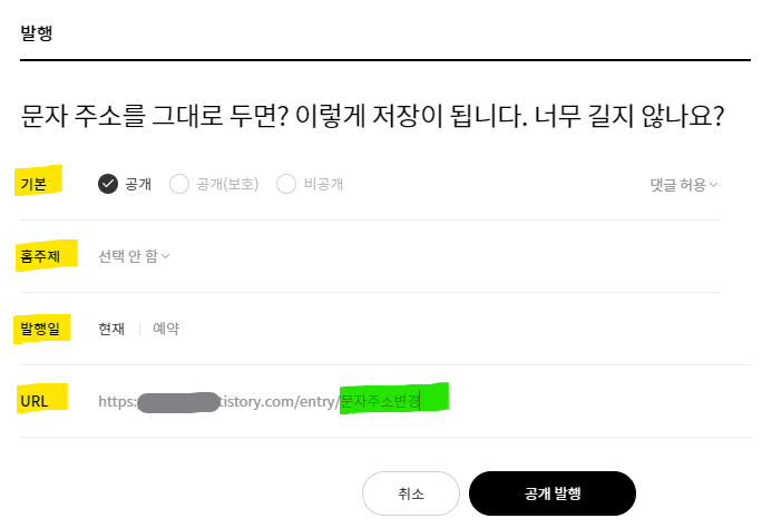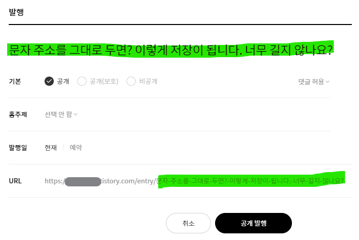 URL 부분을 클릭해서 직접 어떤 문자로 저장할지 타이핑을 칠 수 있습니다. 우리가 발행버튼을 누르기 전 '공개/비공개', '홈주제' 등을 고를 때 '굵은 글씨'로 표시된 부분은 우리가 수정을 할 수 있다는 것인데, URL이 굵은 것을 볼 수 있죠?