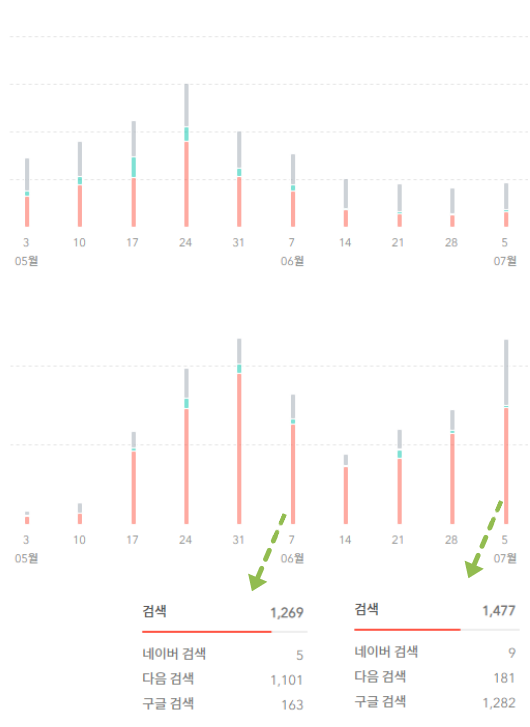 반면에 서브 블로그는 5월 중순 이후 다음 최적화 상태인 것을 이용해서 정보글을 몇 개 쓰니, 5월 중순이후 유입이 지속 상승하는 모습을 보여줬습니다.