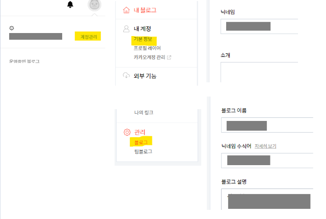A. 하나의 카카오계정으로 했으면 불가능합니다. 티스토리의 닉네임에는 아래와 같은 구조입니다. 카카오계정의 '기본정보'로 들어가면 나오는 닉네임(아래 그림 상단)과 각 블로그마다 닉네임을 꾸며주는 수식어로 되어 있습니다.