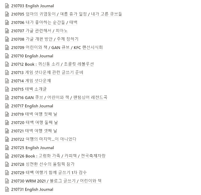 이번 포스팅의 제목에 권태기라는 단어를 넣었는데, 7월 초, 가족 글쓰기에 권태기라는 무서운 병이 찾아왔습니다. 그럼에도 서로 끌고가는 힘으로 겨우 버텨서 아래와 같은 주제들로 글을 썼습니다.