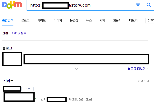 다음 최적화라는 것은 별 것 없습니다. 내 블로그 주소를 다음 검색창에 입력했을 때 '사이트'라는 탭에 내 블로그 이름, 닉네임, 개설일 등이 뜨는 것을 말합니다. 이것이 떠야 검색 결과 노출에 다른 블로그들과 어깨를 나란히 한 조건에서 검색될 수 있습니다.