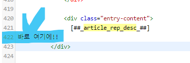 ▲ 두 번째 나오는 치환자입니다. 바로 이곳에서 해당 치환자와 </div> 사이에 넣으면 됩니다. 중간에 엔터 치는 것은 아무 문제가 없으니 422행 </div> 앞에서 엔터를 한 번 치고 그 사이 공간에 애드센스 일치하는 콘텐츠 광고의 코드를 붙여 넣으면 됩니다.