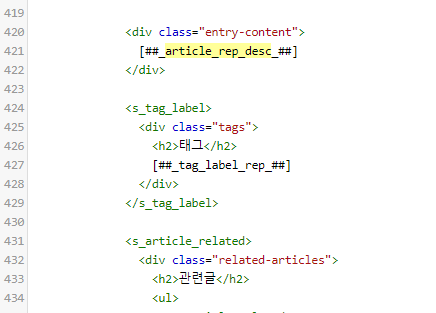 본문이 끝나고 뒤에 태그 붙고, 관련글 붙는 순서 그대로 424, 433에 나와 있는게 보이죠? 그 부분으로 이곳이 맞구나 판단하는 방법도 있습니다.