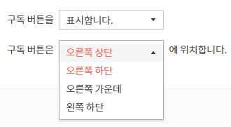 이것을 '표시합니다'로 바꾸면 메뉴바와 구독버튼 각각 지정한 위치에 표시가 됩니다. 지정할 수 있는 위치는 오른쪽 상단, 하단, 가운데, 왼쪽 하단 이렇게 4군데 되겠습니다.