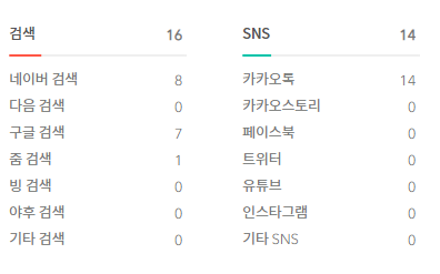 방문 통계의 왼쪽에 있는 2개는 순서대로 검색과 SNS 유입입니다. (아무리 아침이어도 다음 유입 0 실화냐?) 네이버, 다음, 구글, 줌, 빙, 야후, 기타 검색은 이쪽으로 잡혀서 유입 숫자를 정리해 줍니다.