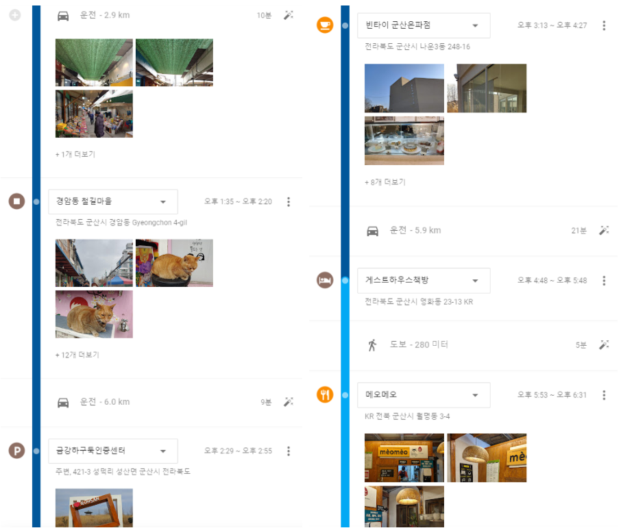 위와 같이 시간대로 다녀온 곳이 어디인지, 어떤 길로 다녀왔는지를 볼 수 있을 뿐 아니라, 구글 포토까지 연결된 계정으로 보면 그 장소에서 찍은 사진까지 보여준다. 블로그에 쓸지 안 쓸지 모르지만, 장소마다 사진은 여러장 찍은 노력이 보여진다.