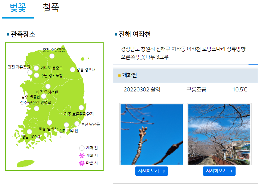 예를 들어 벚꽃 관광지 중 가장 유명한 곳이라 볼 수 있는 진해 여좌천의 경우 3월 2일은 꽃망울만 있는 상태라는 걸 알 수 있다. 여좌천 로망스다리 상류방향 오른쪽 벚꽃나무 3그루가 그 기준이라고 한다. 영광의 자리를 차지하는 3그루의 나무들이군.
