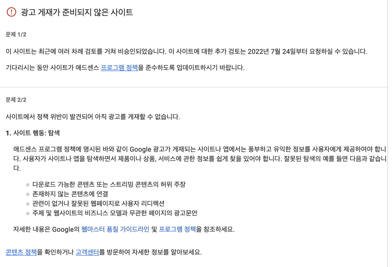 고작 3번 퇴짜를 놓으면서 '여러 차례 검토'라니, 너무하지 않냐. 내가 25번까지도 도전해 본 사람인데 그때는 여러 차례라고 한 번도 언급 안하더니 아쉽다. 광고 게재 제한 걸렸던 애드센스 계정이라고 조금 더 가혹하게 보는건가?