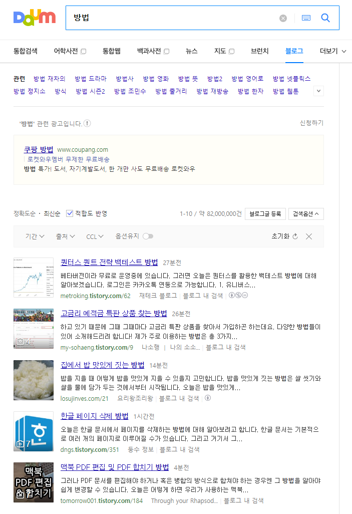 방법으로 확인해 본 결과다. 27분전이 최근 글이라고 하고, 거의 분단위로 죄다 티스토리다. 중간에 도메인 먹인 것도 있지만 티스토리에 도메인 먹인 것이다. 역시 이 키워드로 네이버 블로그가 끼어들 틈이 없지.