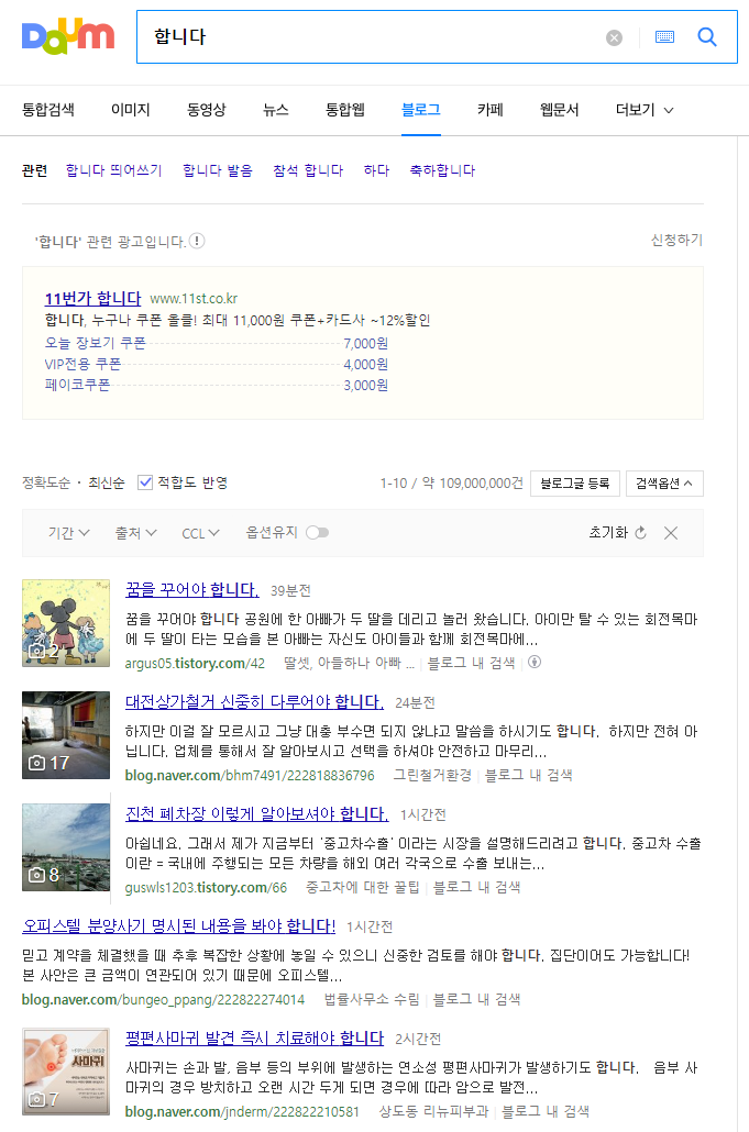 이번에는 '합니다'이다. 존댓말 형태로 글을 쓰면 한 번은 나오는 단어. '습니다'로 해 볼걸 그랬나? 이건 티블과 네이버가 적절히 섞여서 나온다.