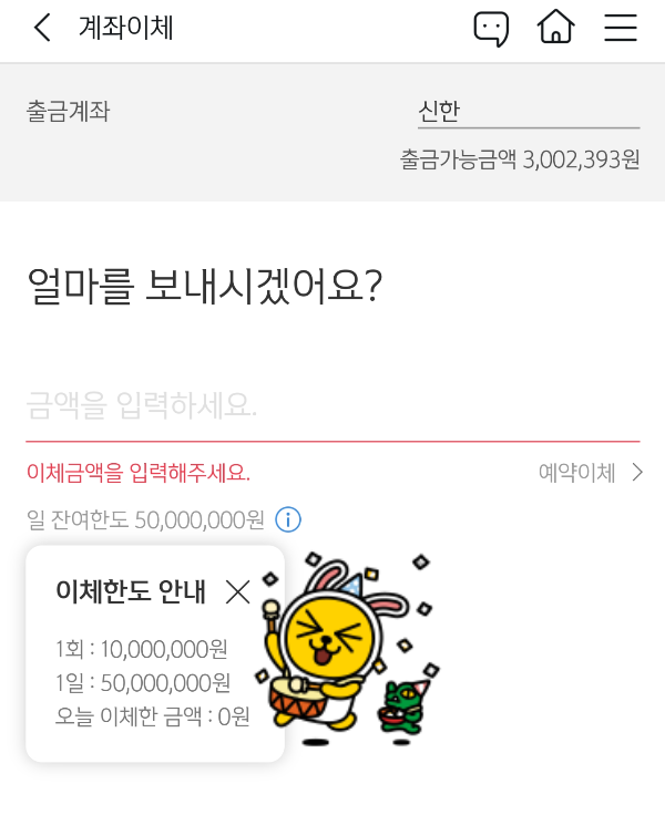 이미 위에서 확인했지만, 한 번 더 확인 사살을 해 보겠습니다. 아래 계좌 이체화면에서 보여지는 모습입니다. 출금 가능금액은 마이나스 한도 붙어서 3백만원이 넘고, 이체 한도는 1회 1천만원, 1일 5천만원으로 정상 계좌와 동일합니다.