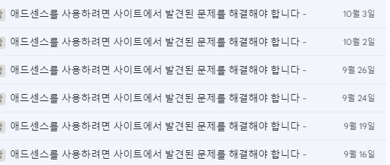 9월 중순부터 애드센스에서 '사이트가 다운되었거나 사용할 수 없음'의 사유로 '발견된 문제를 해결'하라는 메일을 받고 있습니다. 이 메일을 받는데 익숙하기는 하지만, 저렇게 짧은 간격으로 반복적으로 받게 되면 아무리 그릿(GRIT)이 있다고 해도 기운은 빠지게 마련입니다.