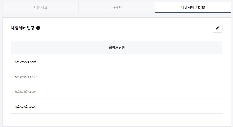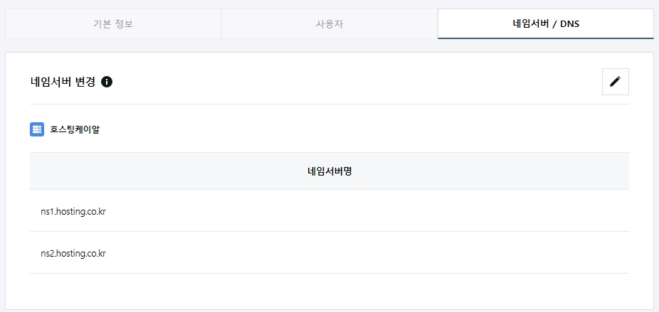호스팅케이알 네임서버를 그대로 사용하는 경우 (아무런 설정을 바꾸지 않은 경우)에는 기본적인 네임서버는 ns1.hosting.co.kr과 ns2.hosting.co.kr로 설정되어 있습니다. 오른쪽 위를 보면 연필 모양의 아이콘이 있지요? 그곳을 누르면 네임서버를 바꿀 수 있습니다.