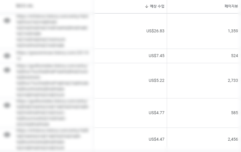 수익이 어느 글에서 나왔는지 한 눈에 볼 수 있습니다. 저는 문자 주소로 해 놓은 블로그가 있다보니 왼쪽이 너무 길게 나오는 단점이 있긴 하네요. 한글 주소 그대로 표시가 되었다면 더 알아보기 편할텐데 구글이 거기까지 신경을 써 주진 않겠죠.